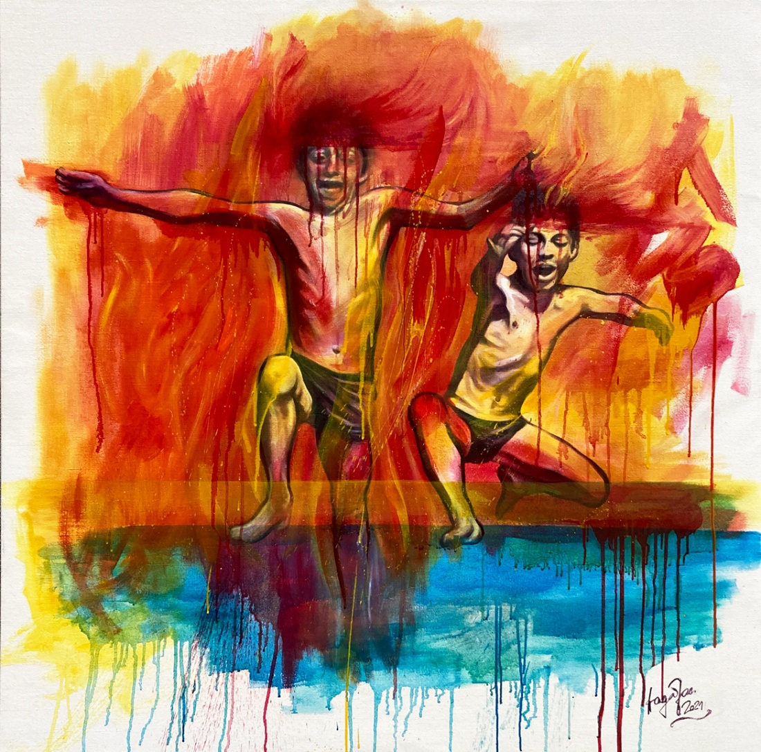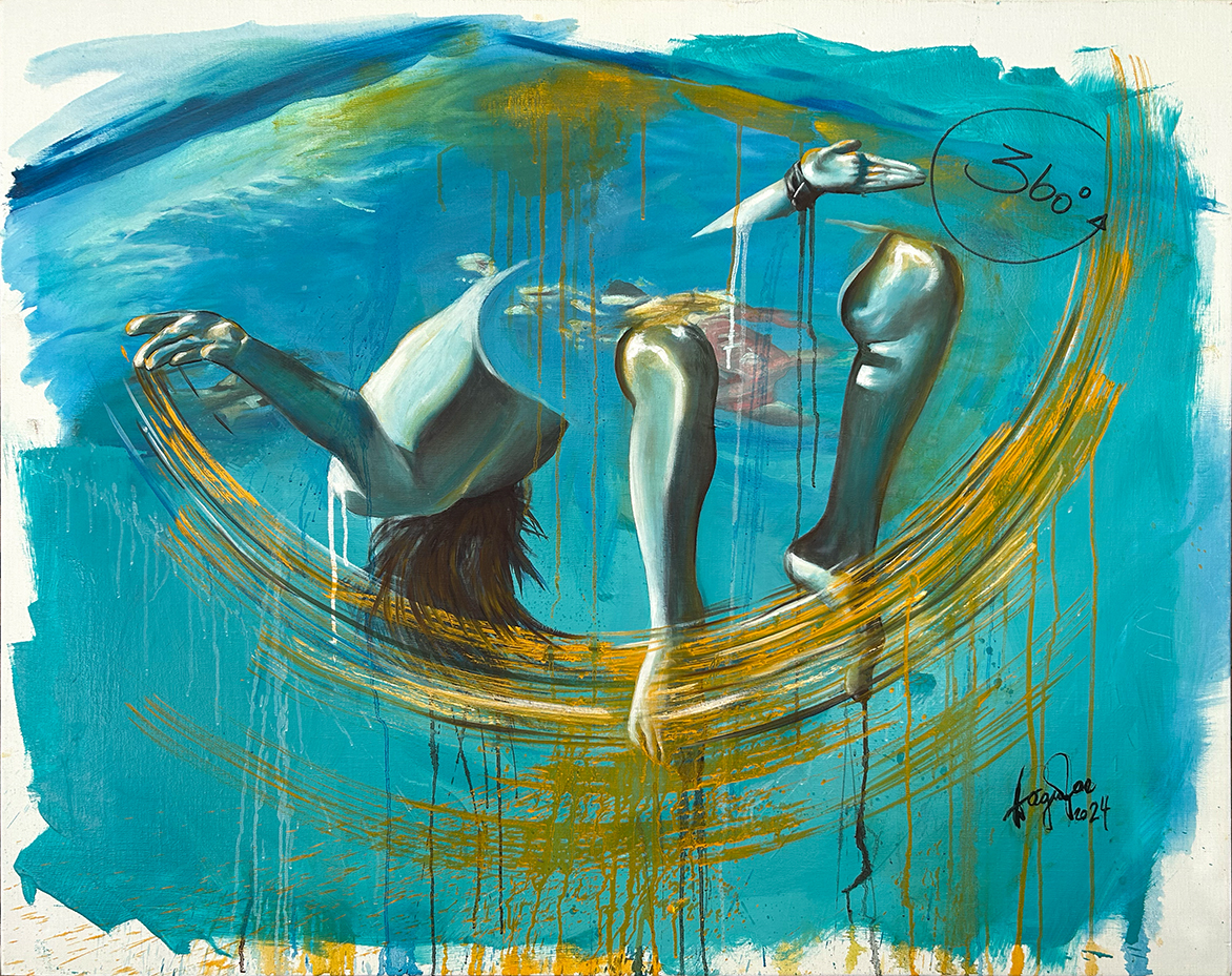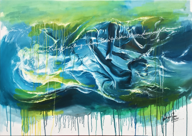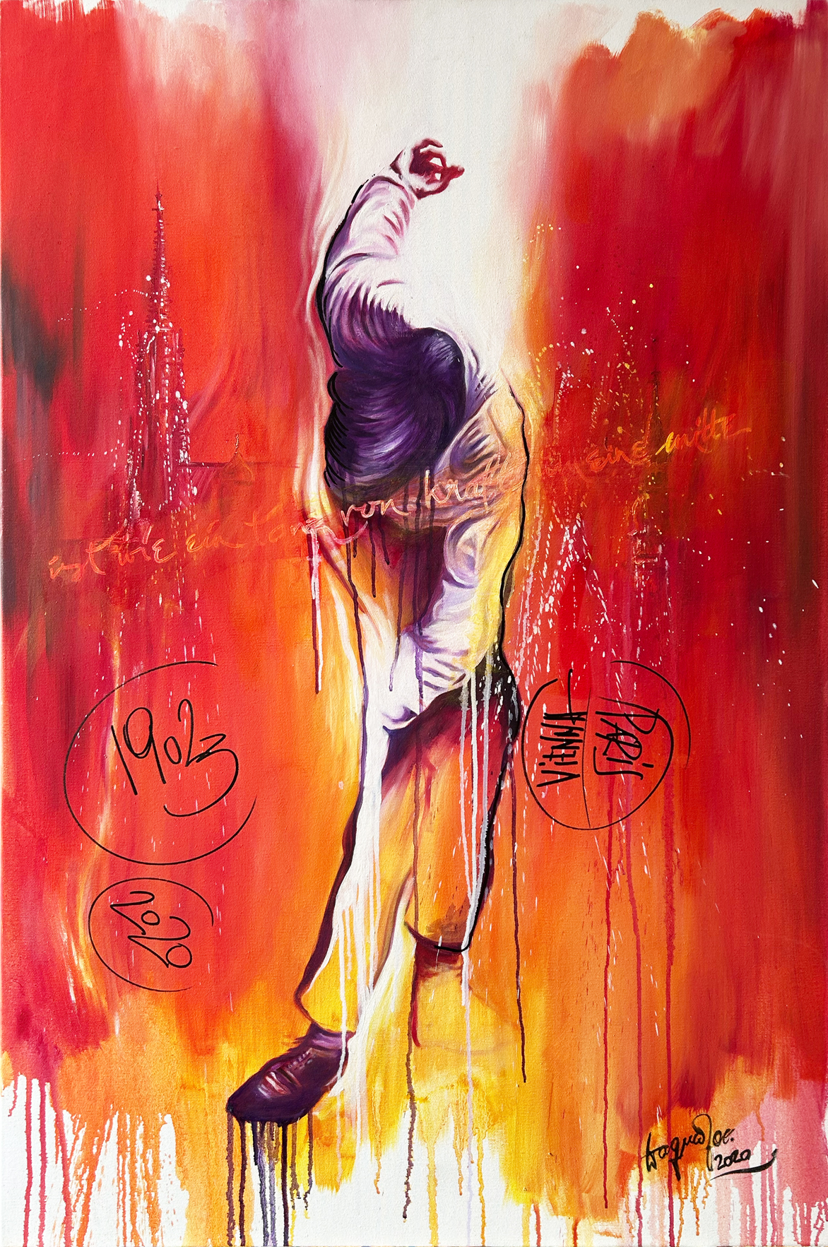 Die Malweise ist energetisch, geschichtet, voller Unterbrechungen.