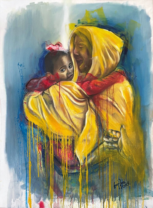 Ruhig, fast ikonisch. Eine Geste zwischen Schutz und Hoffnung,